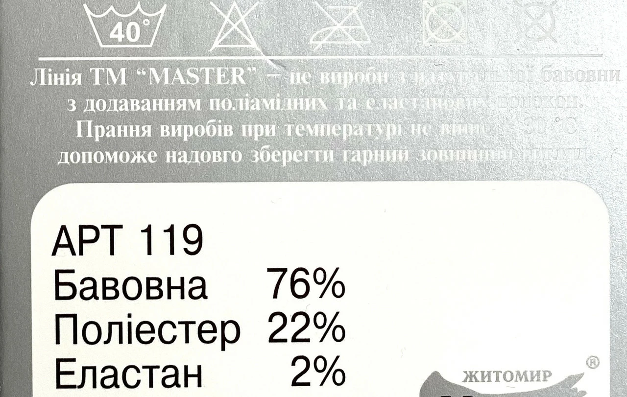 Склад: бавовна — 76%, поліамід — 22%, еластан — 2%.