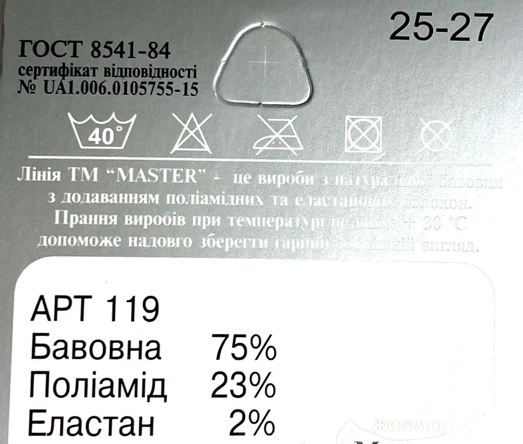 Склад: ХЛОПОК — 75%, поліамід — 23%, еластан — 2%.