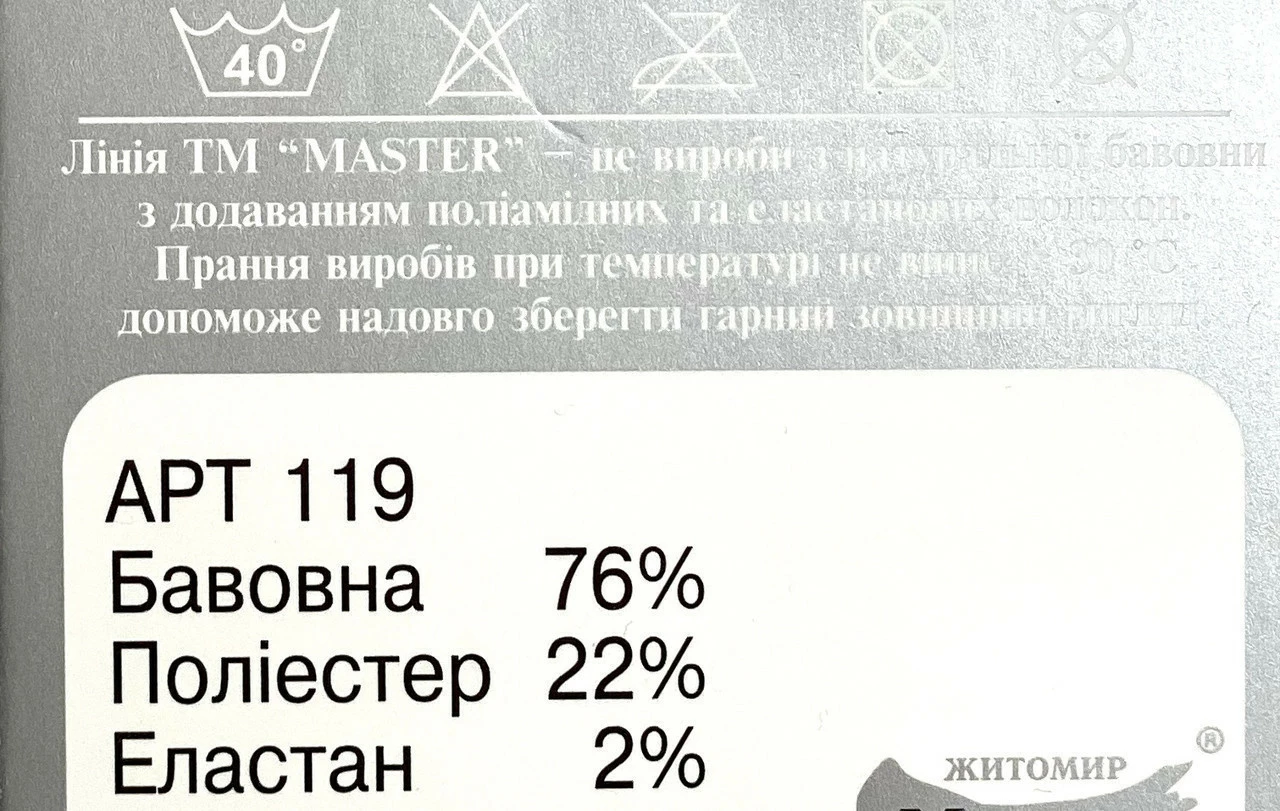 Склад: бавовна — 76%, поліамід — 22%, еластан — 2%.