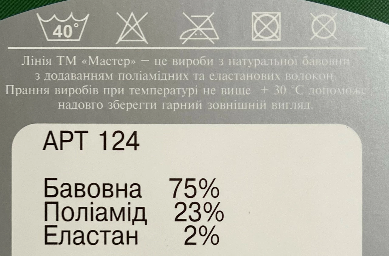 Склад: бавовна — 76%, поліамід — 22%, еластан — 2%.