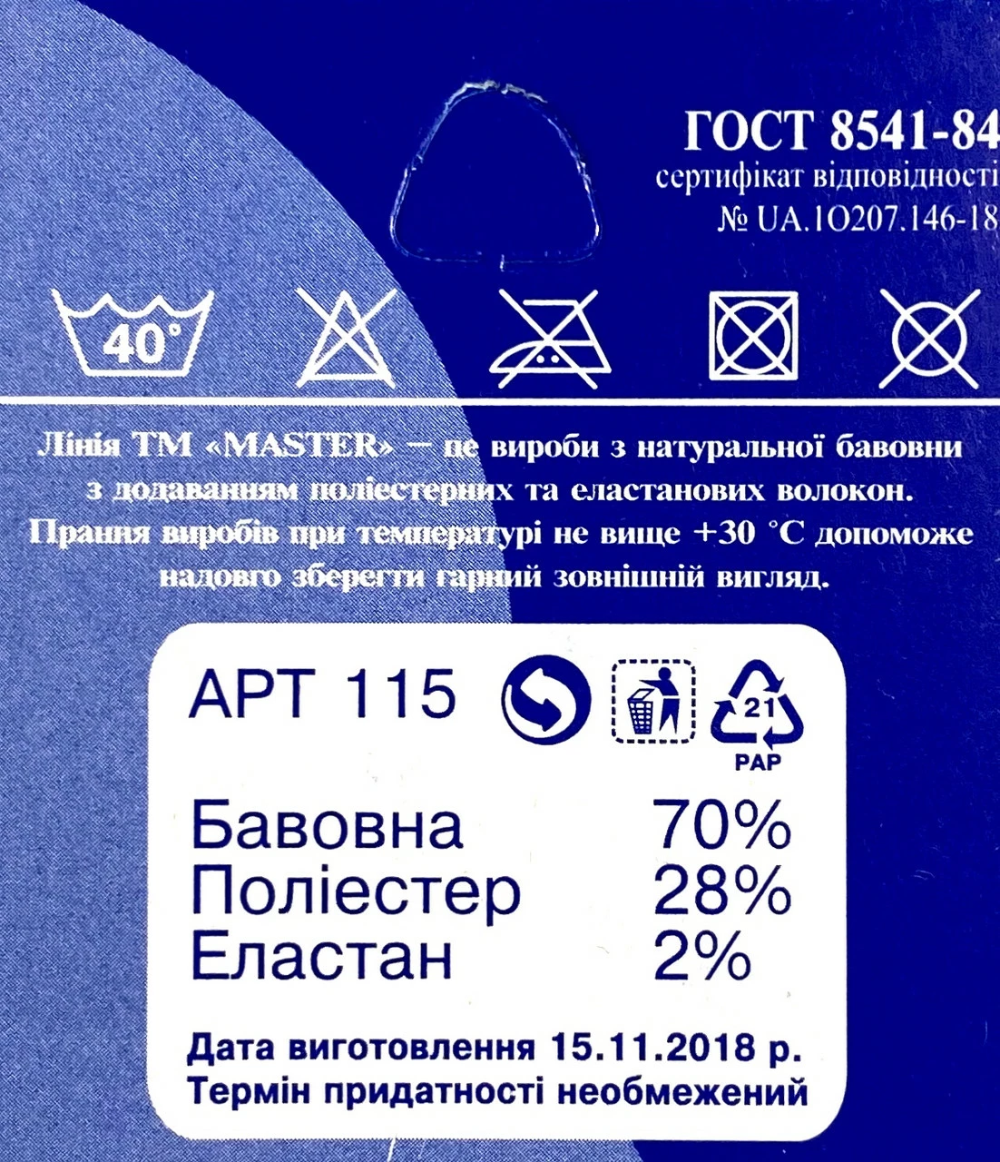 Склад: Бавовна – 70%, поліамід – 28%, лайкра –2%.