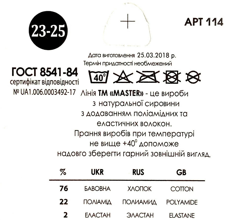 - Состав: Хлопок - 76%, полиамид - 22%, эластан - 2%.
