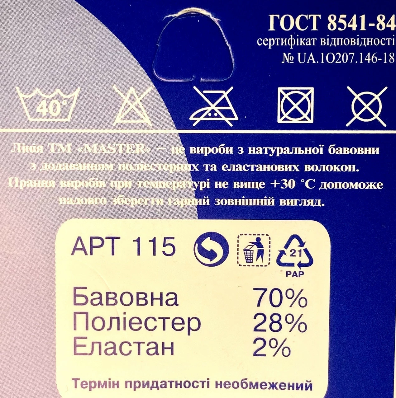 Склад: Бавовна — 70%, поліамід — 28%, еластан — 2%.