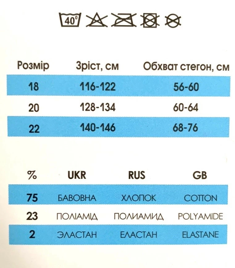 Склад: Бавовна 75%, Поліамід 23%., Еластан 2%.